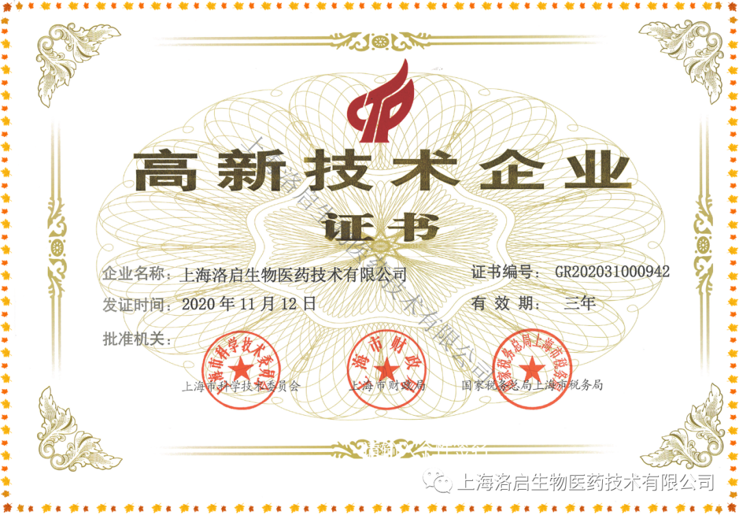 近期,上海dcbox小金库app生物医药技术有限公司取得了由上海市科学技术委员会、上海市财政局、国家税务总局上海市税务局联合颁发的“高新技术企业证书”。